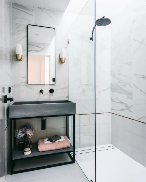 Trough sinks can be designed to be either wall-mounted (floating) or resting on vanities or washstands. Faucets can be either deck-mounted or wall-mounted and the shape of the sink can be... Salvaged wood trough sink vanity topped with concrete in a shared kids bathroom with 3 antique brass faucets. Munger Interiors. view full size. Under a window, an oil rubbed bronze gooseneck faucet is mounted to a concrete washstand countertop over a concrete trough sink. You have searched for double trough sink vanity and this page displays the closest product matches we have for double trough sink vanity to buy
